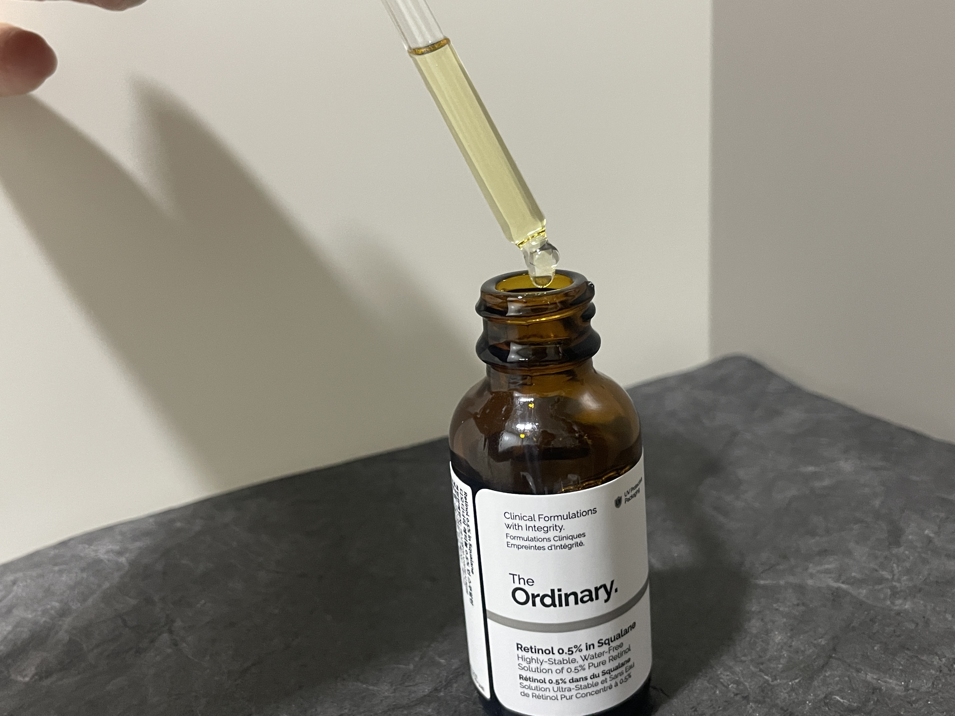 왼쪽 부분이 레티놀 바른 손등입니다. 주룩 흘러내리는 오일느낌이고 제형도 오일처럼 아주 미끌미끌합니다. 레티놀은 햇빛에 노출되면 안돼서 밤에 자기 전에 발라주시고, 보관도 어두운 곳에 해주셔야 해요!